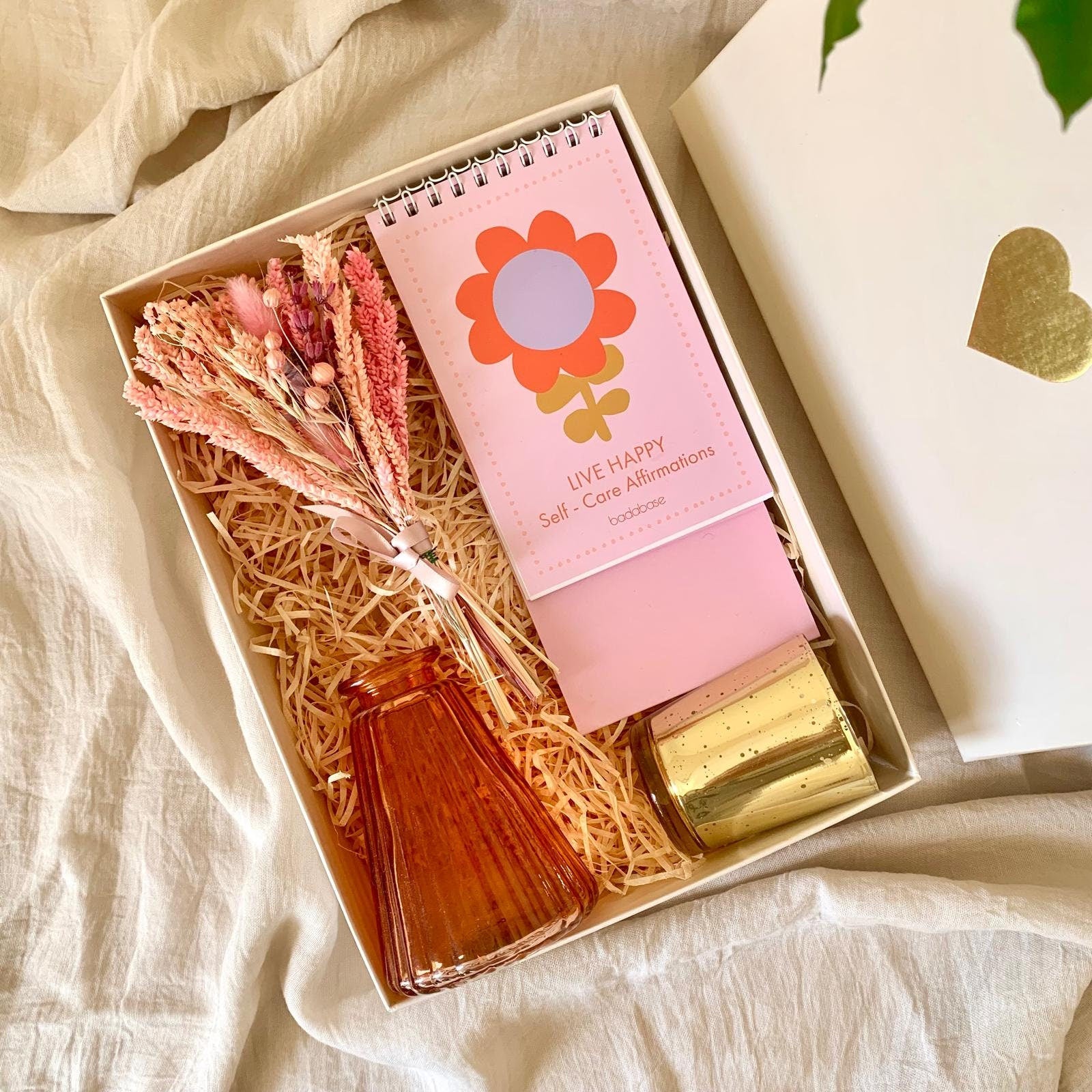 Live Happy Self-care Gift Box, Includes Glass Vase, Dried Flowers Bouquet, Candle Holder, and Affirmation Calendar in a Luxury Gift Box